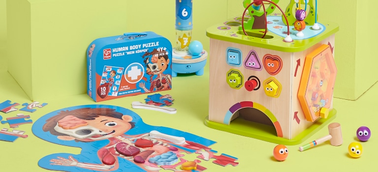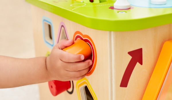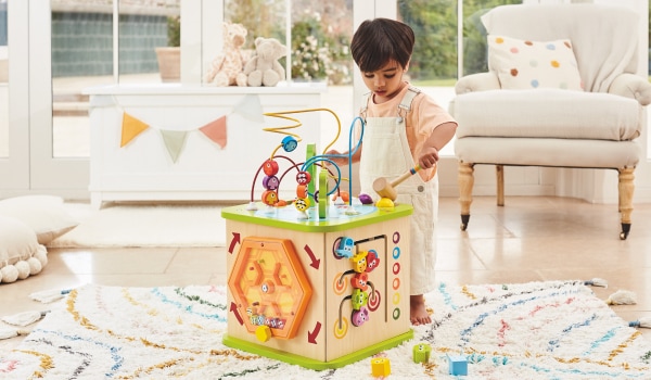 Labirinti, forme, leve e un sacco di animaletti volanti che nuotano o gracidano rendono questo cubo con 5 facce colorate un animato centro di attività. Costruito con legno robusto e colorato con pittura ad acqua, resisterà per tanti anni di divertimento.